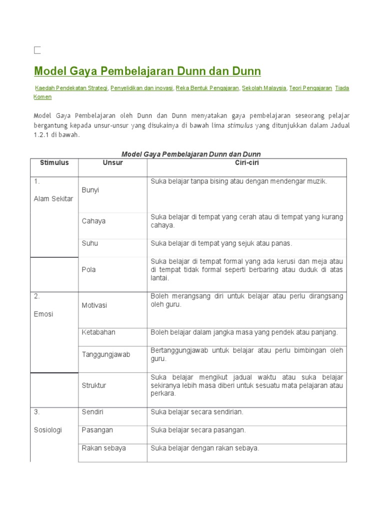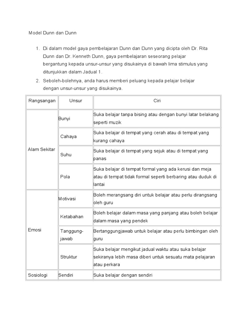 Model Gaya Pembelajaran Dunn Dan Dunn Pdf